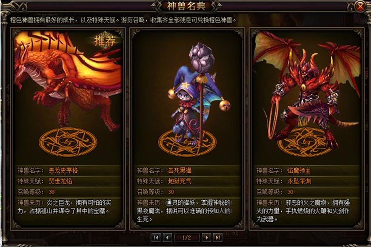 点击神兽界面上方的“神兽名典”可以查看目前游戏内开放的橙色品质神兽。