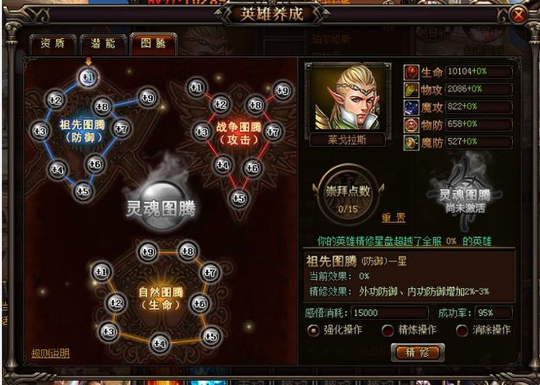 F、英雄精修点满15/15星,同时某单项属性点满9/9星,可以激活灵魂图腾,灵魂图腾效果随机附加,可以通过精修刷新效果。
