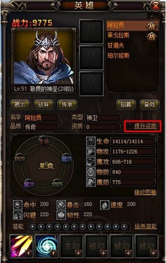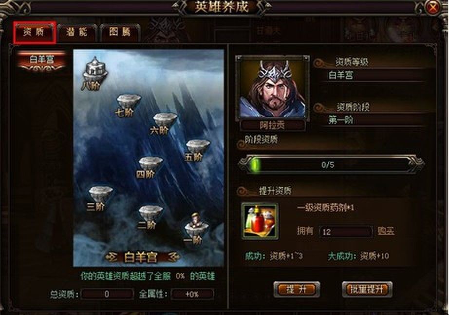 在英雄界面点击“提升资质”按钮,可进入相应界面。英雄资质等级共可分为十二宫,每一个宫都对应一个资质等阶。每一个宫都拥有8阶,当升级八阶以后,将可开启下个宫殿。