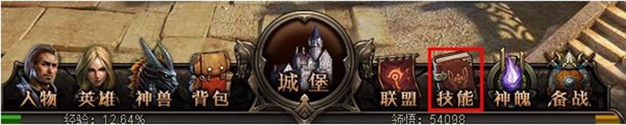 1.玩家可通过界面下方“技能”图标打开功能界面。