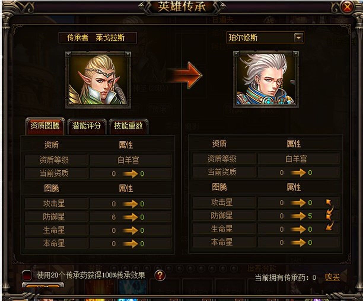2、 传承英雄的资质及段位属性必须大于被传承英雄才能进行传承;