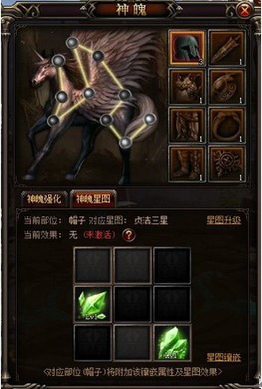 星图:在游戏中一共有八种星图,对应八个神魄镶嵌位。星图类似一个九宫格,并且有着不同的排列规则,可以镶嵌星石,如果星石按照星图的排列规则进行镶嵌,那么装备不仅能够获得星石的属性加成,还能够获得星图的属性提升效果。