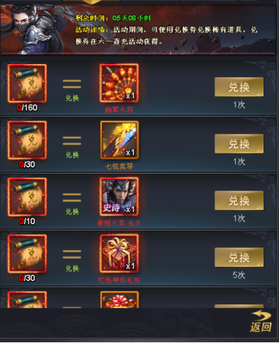 兑换内容:(神兵)幽冥火雨、(神兵)七弦真琴、勇冠三军·永久(赵云时装)、红色神兵礼包、红色命星套餐、法宝和命星材料以及万能觉醒丹等你来拿!