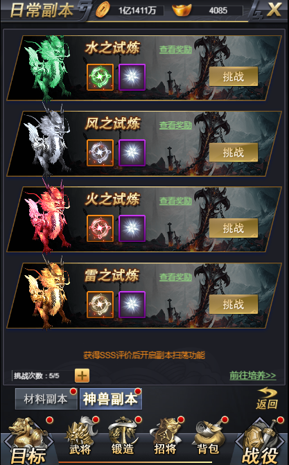 神兽副本分为四个试炼之地,每个试炼之地都产出通用材料上古晶魂