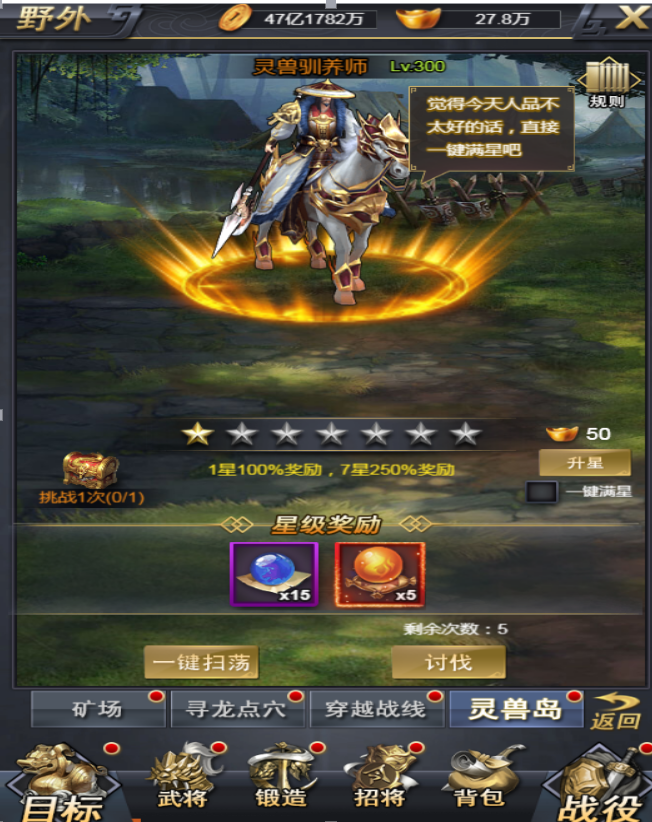 每次消耗一定数量的元宝有几率提升1星,升星失败则元宝不返还;可直接消耗一定元宝进行一键满星。