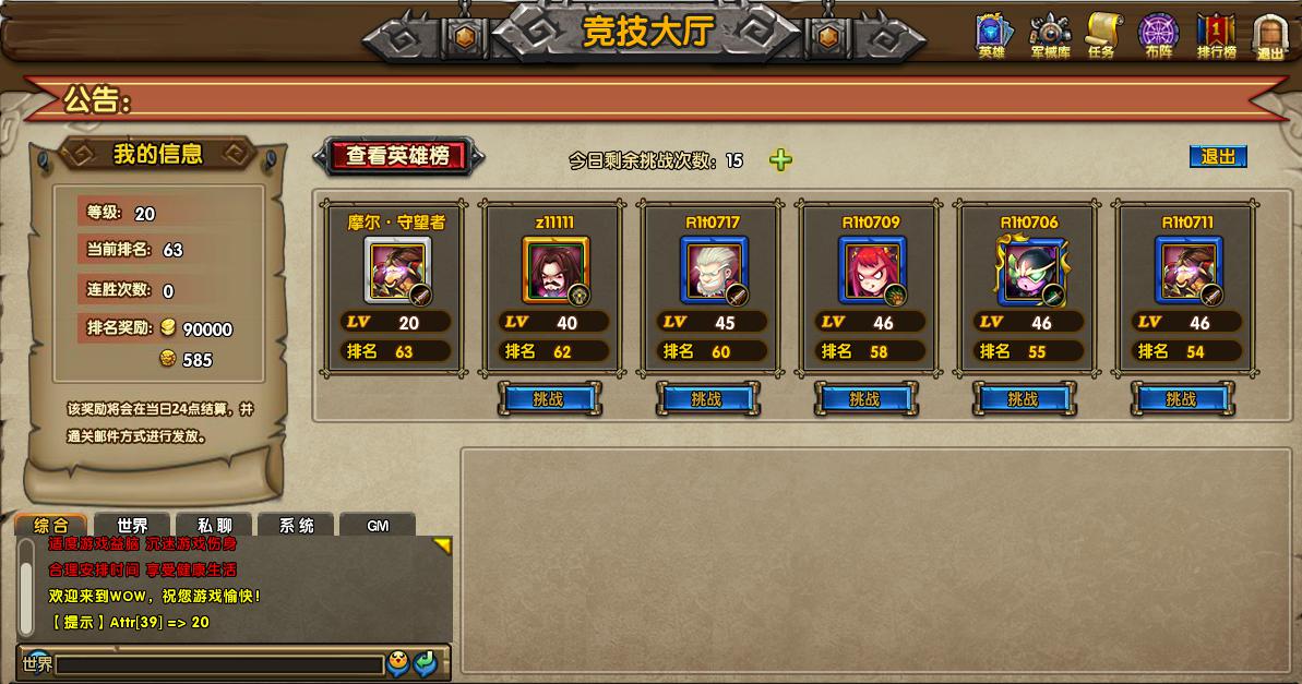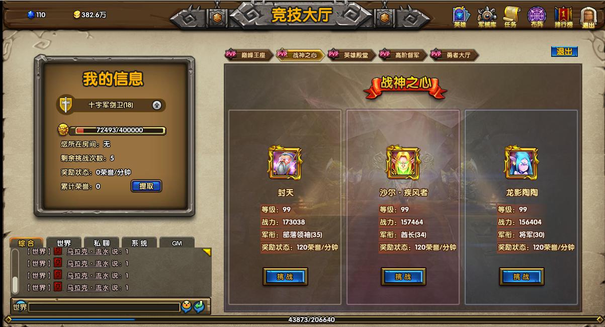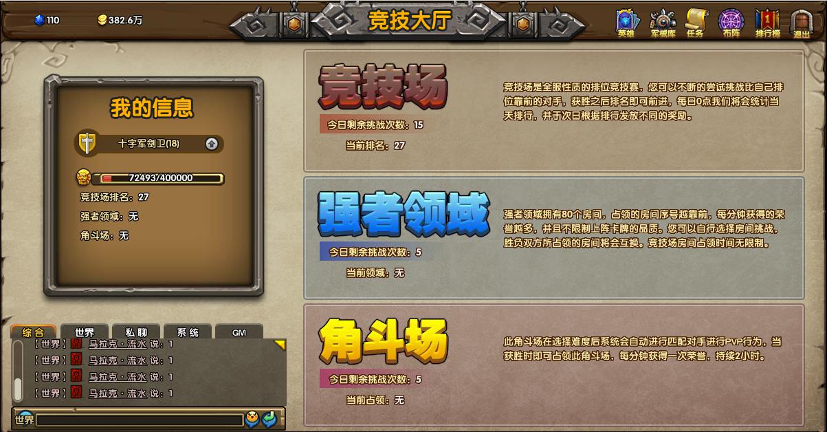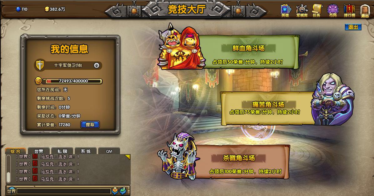竞技大厅分为竞技场,角斗场,强者领域3个玩法,进入需要等级或者军衔要求。