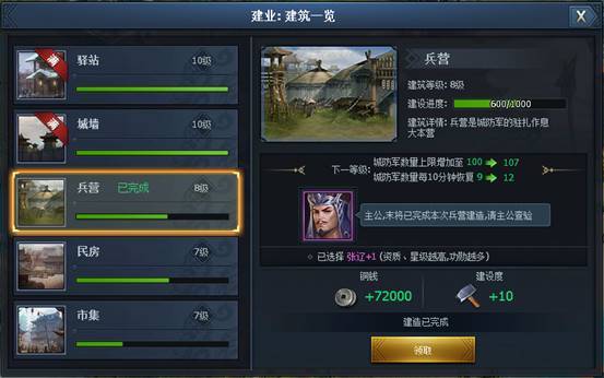 2. 建造完成后即可领取奖励,获得铜钱与城池建设度。