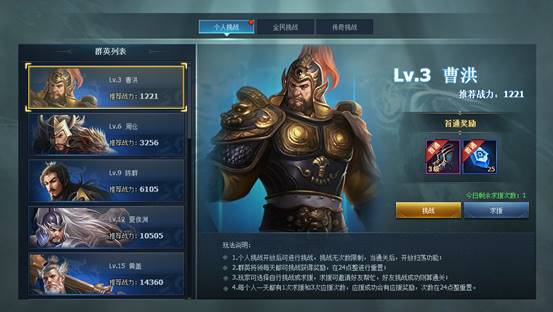 1. 在百战群英中有三个玩法【个人挑战】【全民挑战】【传奇挑战】,每个玩法都可以获得丰厚奖励。
