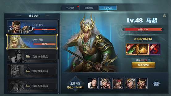 2. 【个人挑战】中有多个不同等级的三国武将等待着玩家的挑战,挑战失败无任何损失,挑战成功后可以获得主公装备、强化石等奖励。每个将领第一次被挑战成功还会有额外的首通奖励。