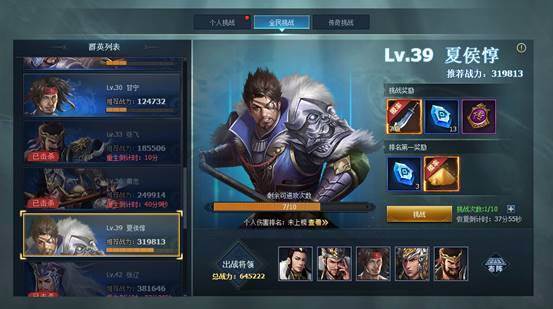 3. 【全民挑战】玩法中,有多个等级的将领可供所有玩家一起挑战,每个将领被挑战10次后即被击败,一段时间后将重生,再次迎接玩家的挑战。