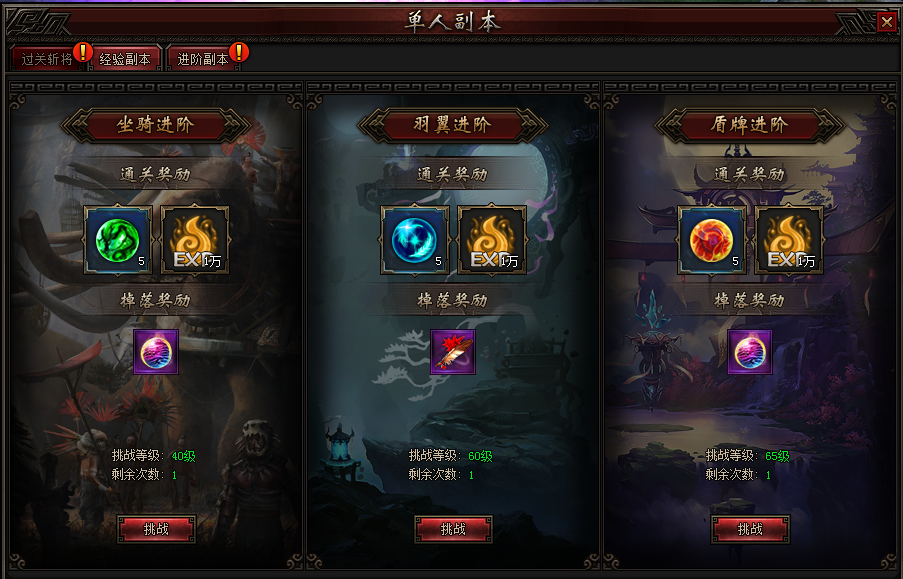 进阶副本分为三个副本,分别是坐骑副本、羽翼副本和盾牌副本。是玩家获取坐骑、羽翼、盾牌系统进阶耗材的重要来源。
