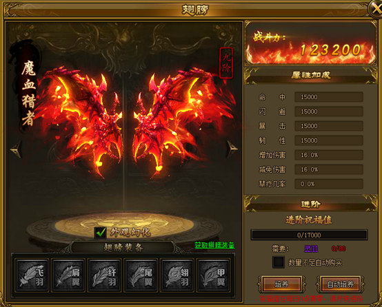 通过消耗翅膀培养丹进行升阶,翅膀升阶后会大幅提高属性