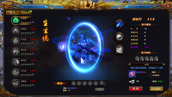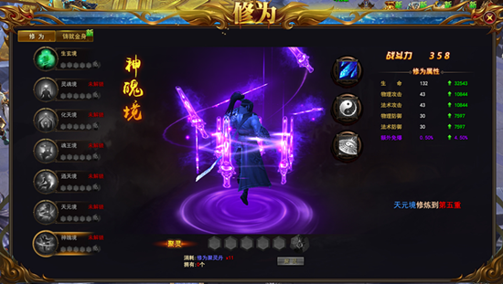 聚灵:每个修为阶段可通过聚灵永久提升人物属性,分别为聚灵一段、聚灵二段、聚灵三段、聚灵四段、聚灵五段、聚灵·凝元,每个聚灵阶段的条件均不相同。