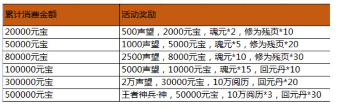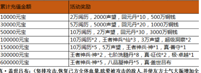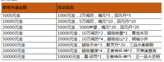 活动内容:活动期间,游戏内充值活动,玩家单笔充值一定金额,即可获得相应的充值奖励。(单笔充值奖励只计算充值元宝最大值,可以单笔重复充值重复领取)