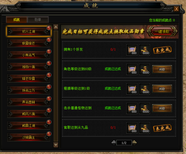 打开成就界面后玩家可见到当前已完成的成就以及为达成的成就