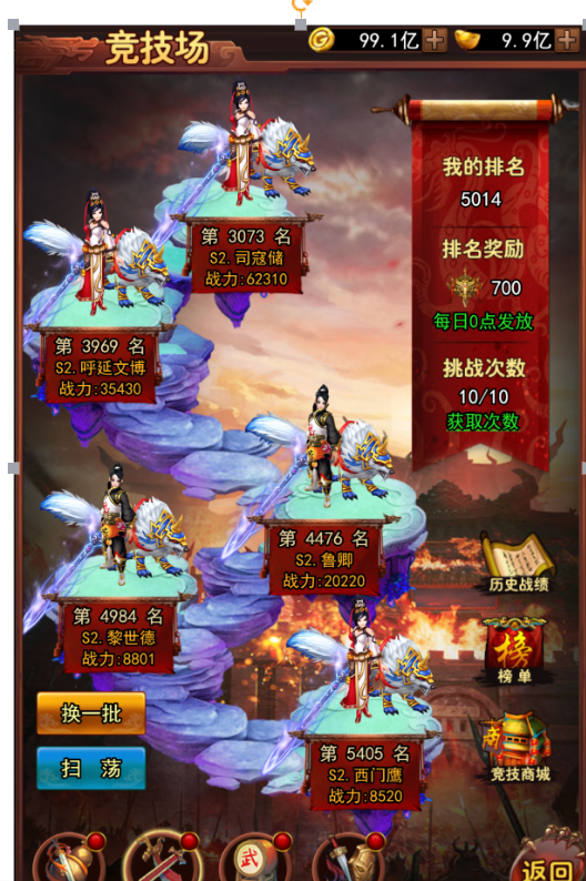 PVP玩法在游戏中的定义统称战场,从主界面二级副菜单可进入。包含试炼、竞技场、天梯赛和护送。其中试炼玩法会随机刷出4名玩家供选择挑战,每次挑战都会获得注灵材料,以及声望统计,声望越高则试炼排行榜名次越高,每天重置时会按照试炼榜发放排名奖励。竞技场为传统玩法,会随机刷出比自己排名靠前的若干名玩家供挑战,击败则互换位置,提高排名,享受排行榜竞技点奖励,用来在指定商城换购各种材料;天梯赛是一项积分段位制的PVP玩法,每天定时开启,随机匹配到符合条件的对手,胜利失败均会获得不同的积分,连胜积分翻倍,天梯赛的血量存在保留机制,直到血量为0为失败,连胜终止。积分决定段位,段位越高奖励越丰厚;护送玩法可随机刷到不同品质的仙女供护送,品质越高,奖励越丰富,护送期间会被其他玩家挑战,被击杀则会损失一部分奖励。