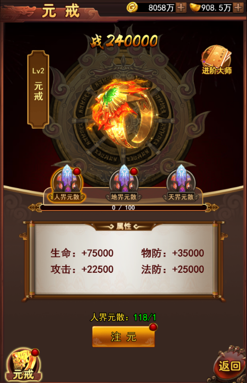 在历练中,开启全新的培养系统--【元戒】,三种天地人元散可增加不同的基础属性,同时还会带来元戒悟性积累,达到一定悟性值,会提高元戒阶段,改变外形的同时还会带来可观的基础属性百分比成长,大额战力等你参加活动来获取!