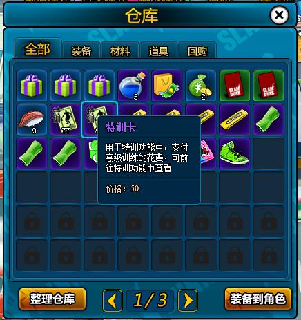 仓库内存放着大家获得道具,有划分装备、材料、道具三大类。