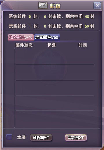 邮箱中,可接收系统或玩家发送的邮件消息,并可以指定玩家发送邮件消息。邮箱有存储空间限制,系统邮件可以保存40封,玩家邮件可以保存60封。邮箱已满后,会提示用户及时清理邮件。邮箱已满后,后续邮件将会无法收取。