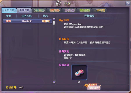领取第一个任务"星的启程",任务目标,要求用户完成一首舞曲。这将是你步入舞坛的第一支舞,一定要好好表现呦,完成任务后,当然还会有不错的道具奖励呦。