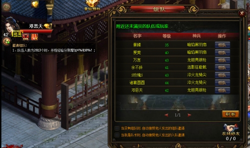 玩家可以通过点击角色头像下面的组队按钮开启组队界面,开启组队界面后即可看到附近的队伍和没有队伍的玩家;