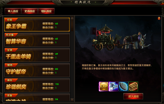 经典战役玩法,包含了众多种类不同的三国著名战役,不同战役在为玩家提供不同剧情体验的同时,还能使参与战役的玩家获得种类众多的珍品道具,主要战役有:象王争霸、智算华容、千里走单骑、守护献帝、珍珑棋弈、官渡之战。