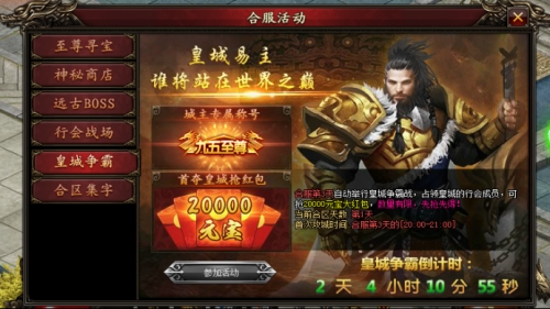 玩法:首次占领皇城行会获得20000元宝红包,占领皇城行会可抢火爆