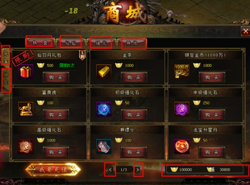 b)玩家在商城中购物需要消耗绑定元宝或者元宝。界面右下方显示玩家目前拥有的元宝和绑定元宝的数量。