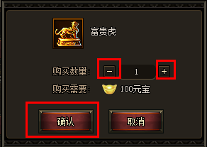 f)点击【购买】按钮后,会弹出商品的购买面板。玩家使用【+】或【-】调整商品的购买数量后,点击确认按钮即可购买。购买的物品可在背包中看到。