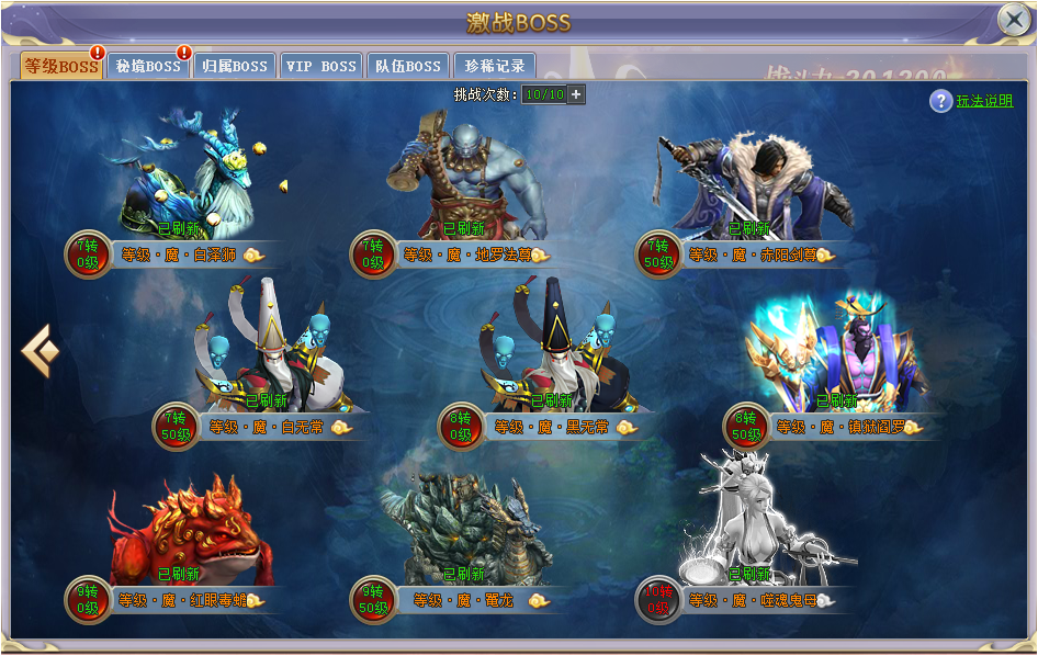 3.等级BOSS死亡后开始刷新倒计时,刷新后可继续挑战,仅在每天10:00-次日01:00时间段内死亡刷新