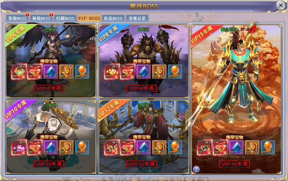 1.VIP等级达到6,8,10,12,15级开启对应等级VIP BOSS