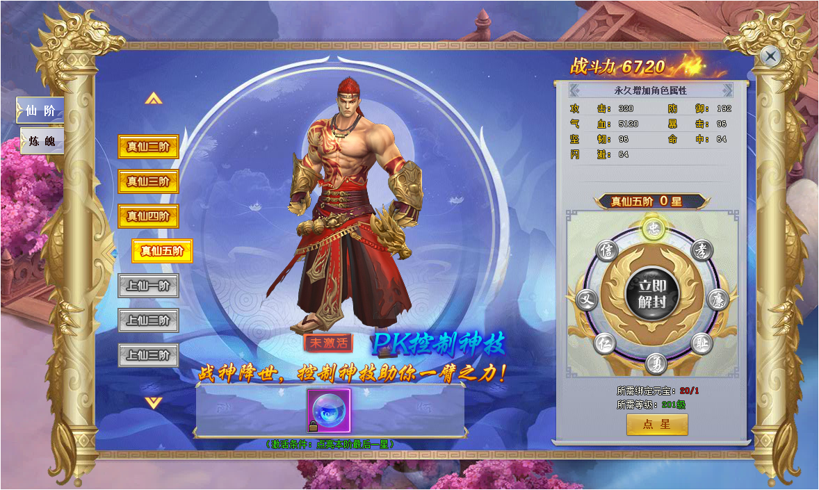 1.等级到达条件时,可消耗绑定元宝对仙阶进行点星