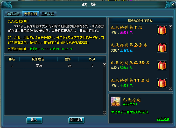 2、前10场不论胜负,均可获得经验和荣誉值奖励。荣誉值可以在【角色-兑换】中兑换物品。