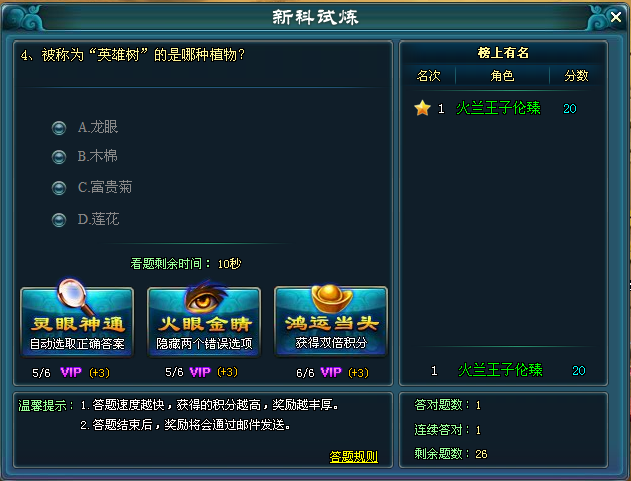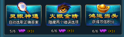 4、答题时可使用几个神奇小功能,非VIP玩家、周、月、半年VIP玩家分别可以使用2、3、4、5次。