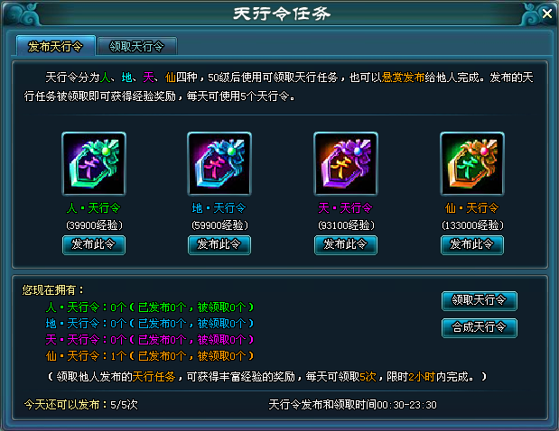 2) 天行令共分人、地、天、仙4级,发布天行任务需要消耗一个相应等级的天行令,等级越高的任务奖励越丰厚;