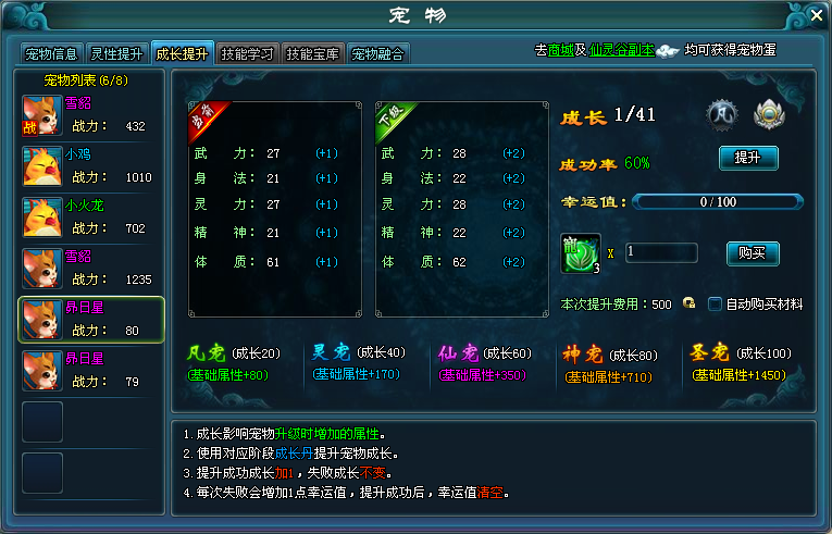 提升成长灵宠初始成长值为0,一共有41级,成长等级直接关系到灵宠升级时可以增加的基础属性点数,成长成功提升后属性值会自动补全。成长每次提升失败不会掉级,会增加成长率,失败次数越多成功率越高。提升到一定级别有额外属性加成。