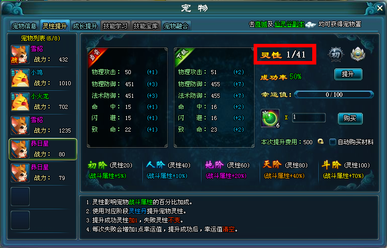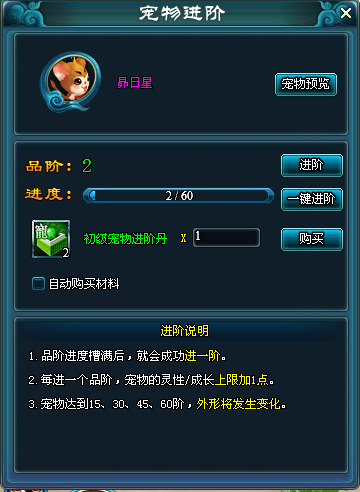 部分宠物可以进阶,进阶的上限级别为60级,每进一个品阶,宠物的灵性/成长上限加1点。