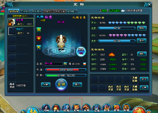 打开灵宠界面,就可以对自己的宠物BB进行灵性和成长提升。