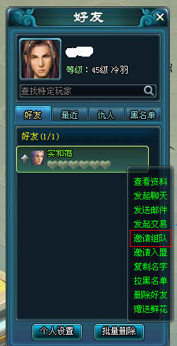 方法三:按F打开好友界面,在好友界面选中想要组队的玩家名字,左键点击后在弹出的菜单中选择“邀请组队”,对方同意后,组队完成。