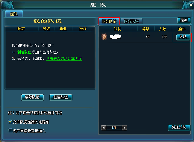 方法二:点击游戏菜单界面的【组队】或使用快捷键T打开组队界面,在【附近队伍】处就可以看到周围的其他队伍,点击【入队】按钮,队长同意后,组队完成。