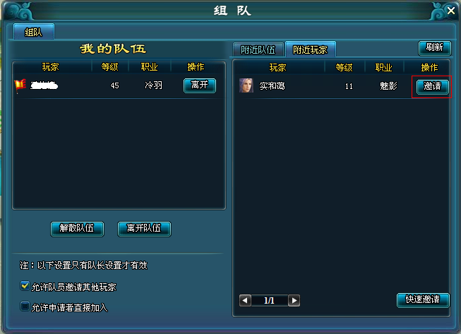 方法二:点击游戏菜单界面的【组队】或使用快捷键T打开组队界面,在【附近玩家】处就可以看到周围的其他玩家,点击【邀请】按钮,对方同意后,组队完成。