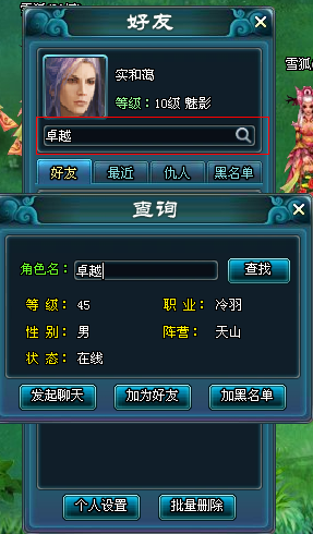 进入天行剑游戏界面,可以在界面下方的游戏系统栏找到【好友】图标。里面有【我的好友】【仇人】【黑名单】【最近联系人】等功能。成功添加的好友,可以看见好友的头像,名称,等级,等信息。