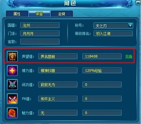 (1)打开游戏下方的『角色』面板,点击『荣誉』按钮,就可以看到自己的声望值。点击声望值右边的『兑换』按钮就可以查看可以兑换的道具。
