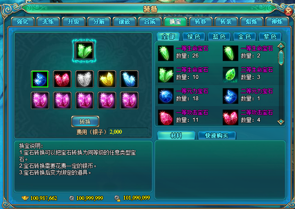 宝石转换可将一种宝石转换成同等级的其他宝石,需要消耗一定数量的游戏币。