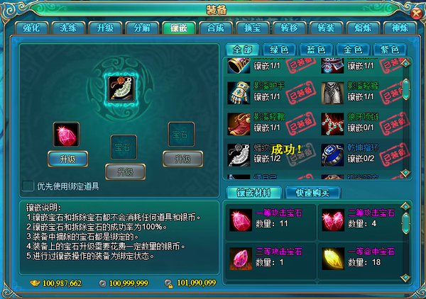 2.宝石镶嵌有部位限制,攻击、命中、暴击宝石可镶嵌在武器、戒指、饰品上;生命、元力、防御、闪躲宝石可镶嵌在衣服、鞋子、裤子、腰带、护手、护腕上。
