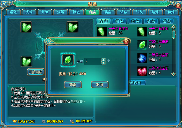 4个同等级同类型的宝石可以合成一个高1级的宝石。