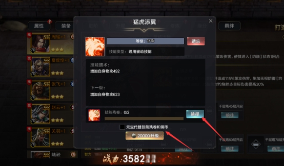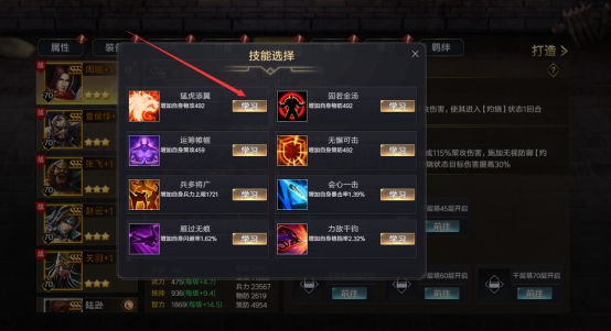 (3)学习技能后,可用技能碎片对技能进行升级,技能等级越高,升级所需技能碎片越多,加成也越高