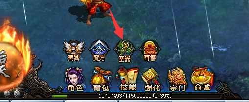 1.点击界面右下方【圣器】按钮,打开奇珍圣器界面。