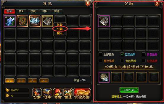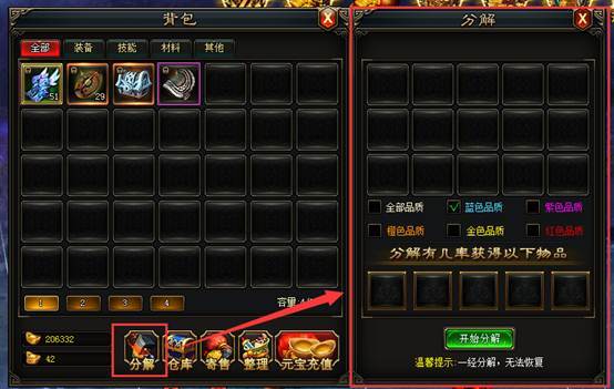 4. 分解获得的道具直接在背包中,如背包满则以邮件方式发送。