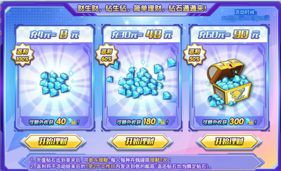 充值达到要求可参与理财,每人每种存钱罐只限一次哦!